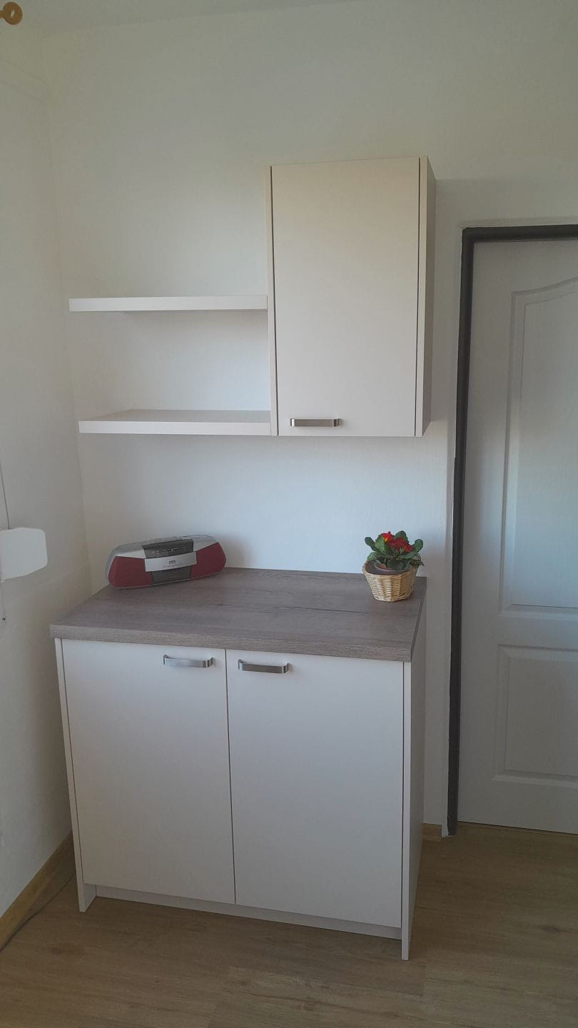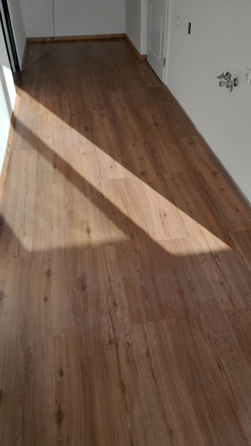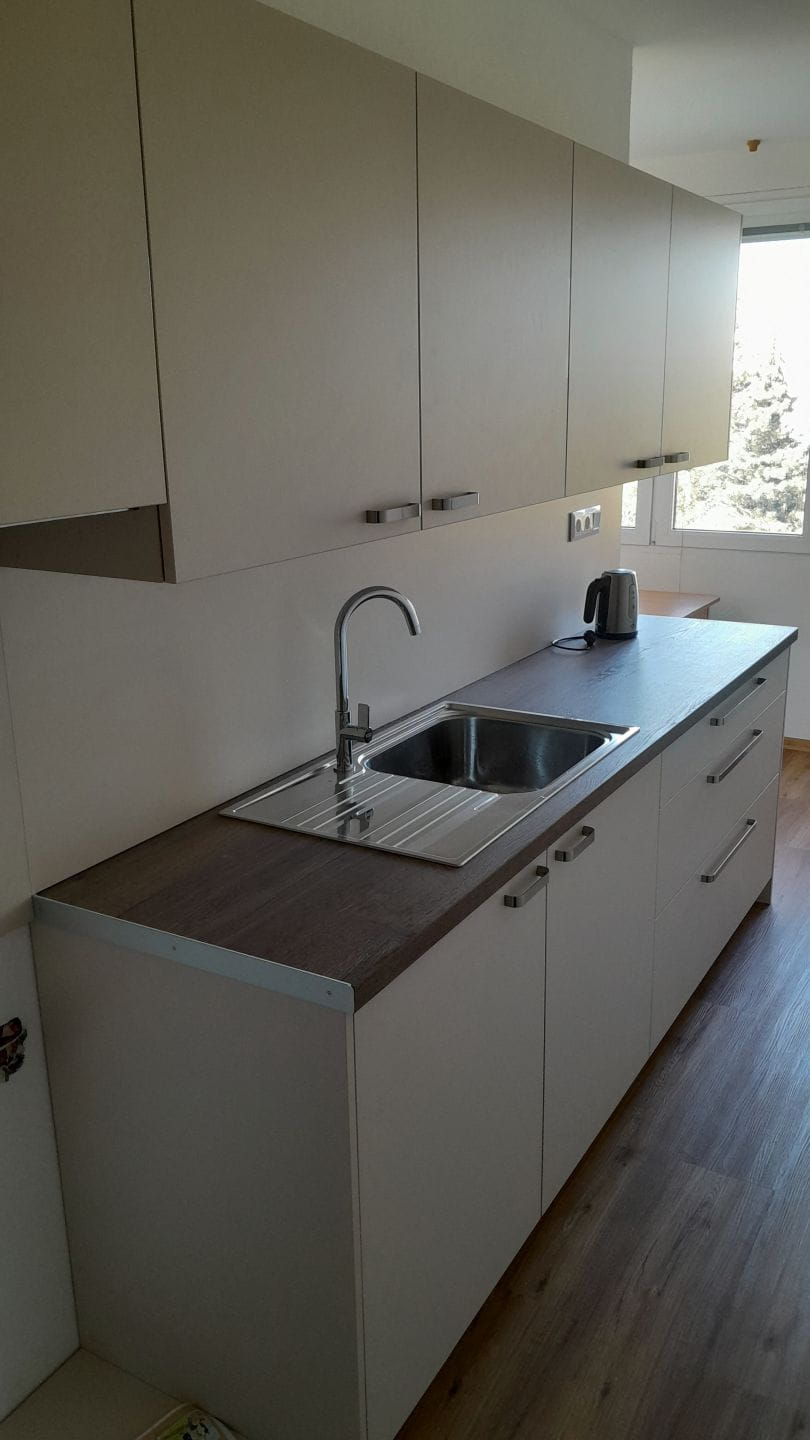 Kompletní rekonstrukce bytového jádra na klíč s pokládkou vinylové podlahy v chodbě a novou kuchyňskou linkou.